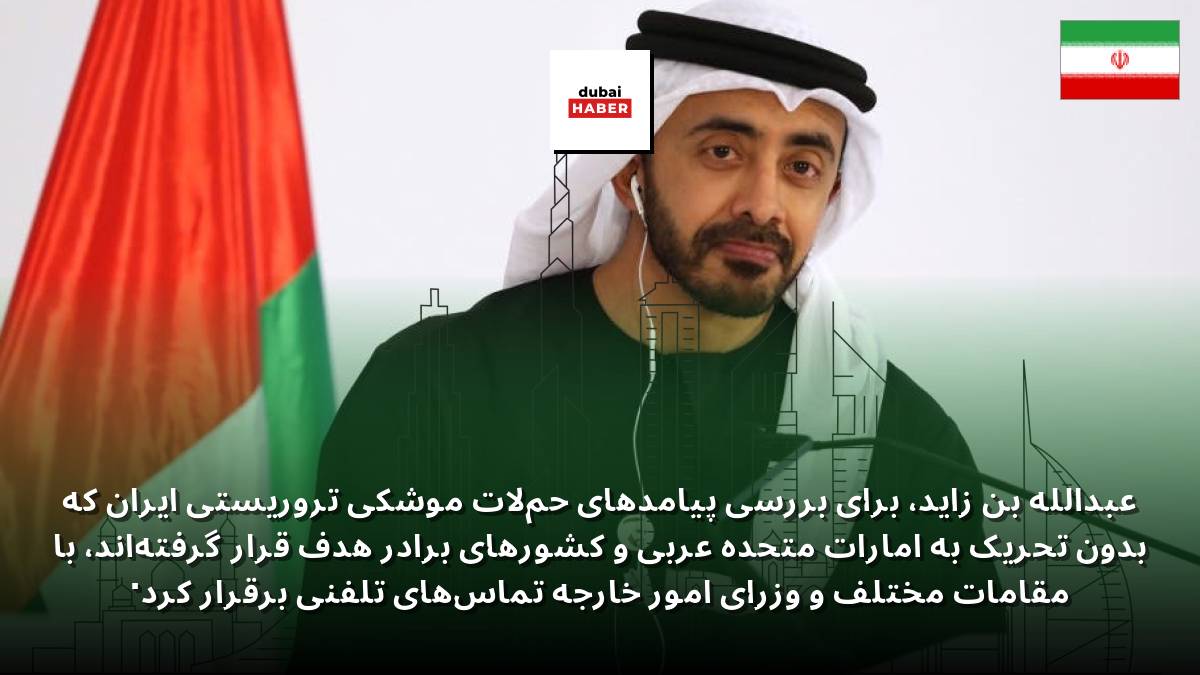 عبدالله بن زاید، برای بررسی پیامدهای حملات موشکی تروریستی ایران که بدون تحریک به امارات متحده عربی و کشورهای برادر هدف قرار گرفتهاند، با مقامات مختلف و وزرای امور خارجه تماسهای تلفنی برقرار کرد.