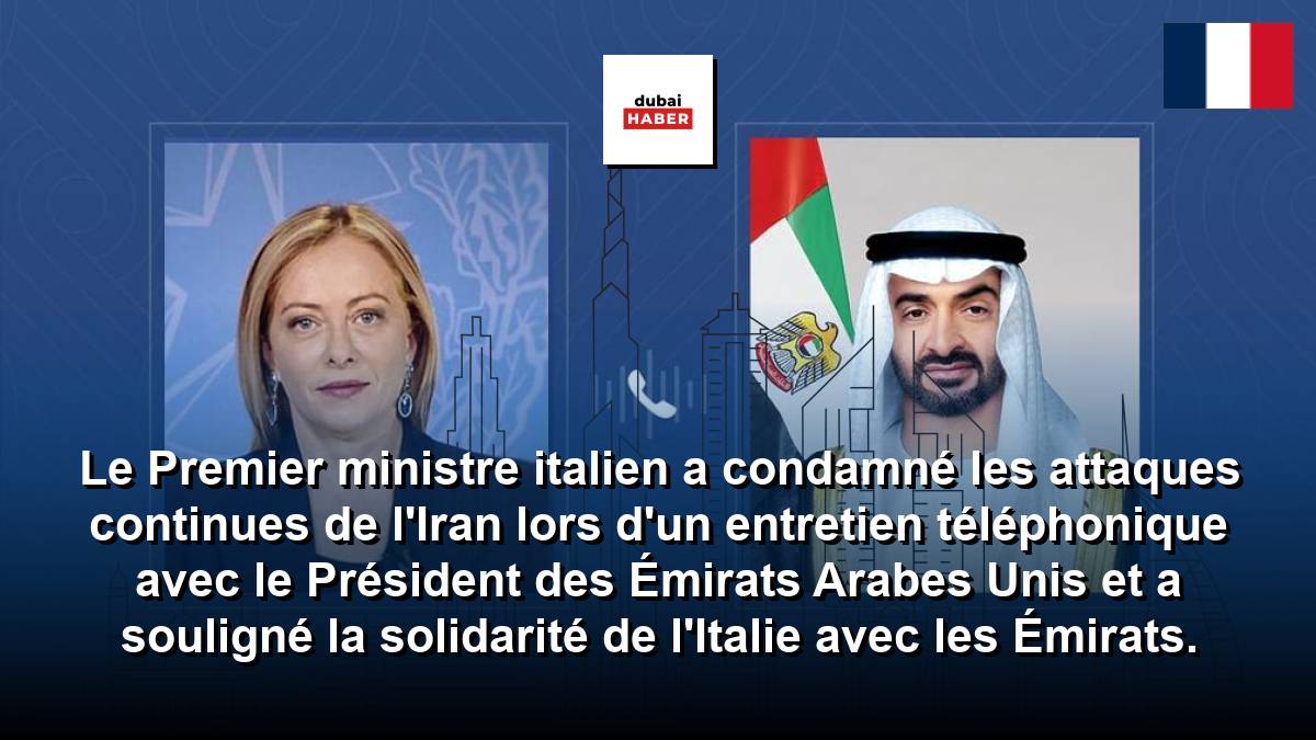 Le Premier ministre italien a condamné les attaques continues de l'Iran lors d'un entretien téléphonique avec le Président des Émirats Arabes Unis et a souligné la solidarité de l'Italie avec les Émirats.