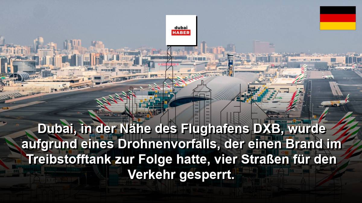 Dubai, in der Nähe des Flughafens DXB, wurde aufgrund eines Drohnenvorfalls, der einen Brand im Treibstofftank zur Folge hatte, vier Straßen für den Verkehr gesperrt.
