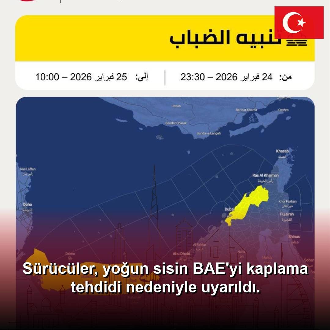 ABU DABİ, 25 Şubat 2026 (WAM) -- Birleşik Arap Emirlikleri'ndeki yolcular ve sakinler, Ulusal Meteoroloji Merkezi'nin (NCM) Salı gecesi geç saatlerde yoğun sis ve hızla kötüleşen görüş koşulları için bir hava durumu uyarısı yayınlaması nedeniyle son derece dikkatli olmaları konusunda uyarıldı. Hava durumu bürosu, yatay görüş mesafesinin önemli ölçüde düşebileceğini ve bazı zamanlarda neredeyse sıfıra inebileceğini bildirdi. Atmosferik koşulların, 23:30'dan itibaren 24 Şubat Salı günü, en azından Çarşamba sabahı 10:00'a kadar devam etmesi bekleniyor. NCM, sürücülerin hızlarını azaltmalarını, araçlar arasında güvenli bir mesafe bırakmalarını ve sisli koşullarda tehlike ışıklarını kullanmaktan kesinlikle kaçınmalarını tavsiye ediyor.