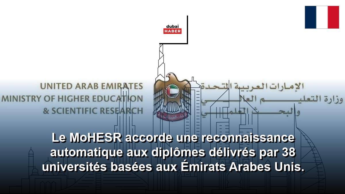 ABOU DABI, 8 avril 2026 (WAM) -- Le Ministère de l'Enseignement Supérieur et de la Recherche Scientifique (MoHESR) a annoncé que cinq établissements d'enseignement supérieur (EES) ont participé à l'initiative de reconnaissance automatique des diplômes, portant le nombre total à 38. Cette initiative permet aux étudiants de faire reconnaître leurs diplômes de manière instantanée et automatique, sans avoir à postuler après l'obtention de leur diplôme, grâce à un système électronique intégré en temps réel, leur permettant de poursuivre leurs études supérieures ou d'entrer sur le marché du travail, tout en répondant aux besoins des diplômés sans nécessiter de procédures de reconnaissance supplémentaires. Cela renforce ainsi la préparation des diplômés pour la prochaine étape de leur parcours académique ou professionnel. Cette démarche soutient l'objectif de Bureau de la Zéro Bureaucratie du Ministère, simplifiant les procédures, augmentant l'efficacité des services et améliorant l'expérience globale des parties prenantes dans le secteur de l'enseignement supérieur. Ce service, valable pour les diplômes délivrés par des EES basés aux Émirats Arabes Unis, permet aux clients de vérifier les qualifications des établissements accrédités par le MoHESR via un code QR approuvé ; ce code confirme que la reconnaissance a été officiellement validée conformément aux réglementations et procédures établies. L'expansion repose sur le succès obtenu depuis le lancement du service, et des efforts se poursuivent pour inclure davantage d'EES. Parmi les EES bénéficiant de cette initiative figurent l'Université des Émirats Arabes Unis, l'Université Zayed, les Collèges de Haute Technologie, l'Université de Sharjah, l'Université Américaine de Sharjah, l'Université Khalifa, l'Université de Médecine et des Sciences de la Santé Mohammed Bin Rashid, l'Université d'Abou Dabi, l'Université d'Ajman, l'Université Al Ain, l'Université de Wollongong à Dubaï, l'Université Liwa, l'Université Canadienne de Dubaï, l'Université de Médecine du Golfe, l'Université de la Ville d'Ajman, l'Université Américaine de Dubaï, l'Université Al Qasimia, l'Université Al Wasl, l'Université Amity de Dubaï, l'Université Américaine de Ras Al Khaimah, l'Université de Dubaï, l'Université Sorbonne d'Abou Dabi, l'Académie Rabdan, l'École de Gestion d'Abou Dabi, l'Université de Jumeira, l'Institut de Design et d'Innovation de Dubaï, l'Université Heriot-Watt de Dubaï, l'Université Américaine des Émirats, le Politecnico d'Abou Dabi, l'Université de Médecine et des Sciences de la Santé de Ras Al Khaimah, l'Université des Sciences Humaines Mohamed Bin Zayed, le Collège des Sciences de la Santé Fatima, l'Université Britannique de Dubaï, l'Université de Fujairah, l'Université de Médecine de Dubaï, l'Académie Éducative de Sharjah, l'Université Umm Al Qaiwain et l'Université de l'Aviation des Émirats. Dans le cadre de son système de services intégrés et de ses efforts pour la Zéro Bureaucratie, le MoHESR propose divers services électroniques pour soutenir les processus de reconnaissance des qualifications, tels que la vérification de l'état de reconnaissance des diplômes obtenus à l'étranger et la fourniture de copies numériques des certificats de reconnaissance. Ces services réduisent l'intervention humaine et font gagner du temps aux demandeurs, tout en garantissant la fiabilité des données et un accès facile pour les autorités concernées.